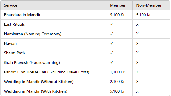 For Members, several religious ceremonies are available either at the Mandir or at home with the support of our Pandit Ji.